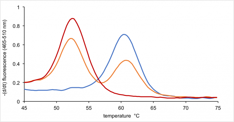 Three blood samples with known genotype were used. All the genotypes can clearly be identified. The blue curve shows the specific wild type (homozygous G;G) peak at 61°C. The red curve shows the specific mutant (homozygous A;A) peak at 53°C. A heterozygous case (A;G) will result in both melting curve peaks, respectively at the same specific temperature for wild type and mutant (orange curve).