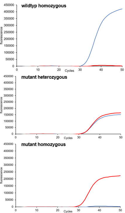 Heterozygous blood samples will give an intermediate signal and amplification plots with very similar intensities in both channels 1 and 2 (blue and red curve). Homozygous mutant blood samples, channel 1 (ROX) will show a strong signal and amplification plot (red curve) and channel 2 (Cy5) none or a very low signal and amplification plot (blue curve). So the signals are reversed on homozygous mutant samples.