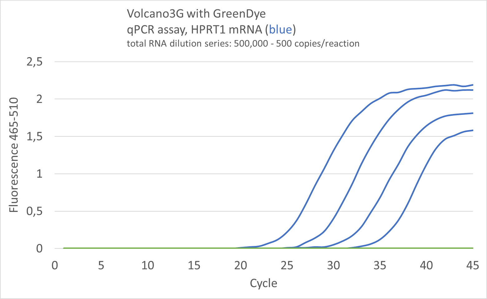 Volcano3G shows an improved detection of mRNA down to 500 total copies, which is clearly distinguishable from the No Template Control (NTC). The brighter fluorescent signal provided by the Volcano 3G Master Mix enables an easy and precise quantification. Volcano3G RT-PCR mix showed to be more sensitive than our Volcano2G RT-PCR mix by a factor of 10. Here, artifical HPRT1 mRNA was detected down to 500 copies with Volcano3G RT-PCR 2x Master mix that contains a sensitive DNA binding dye with negligible polymerase inhibition.